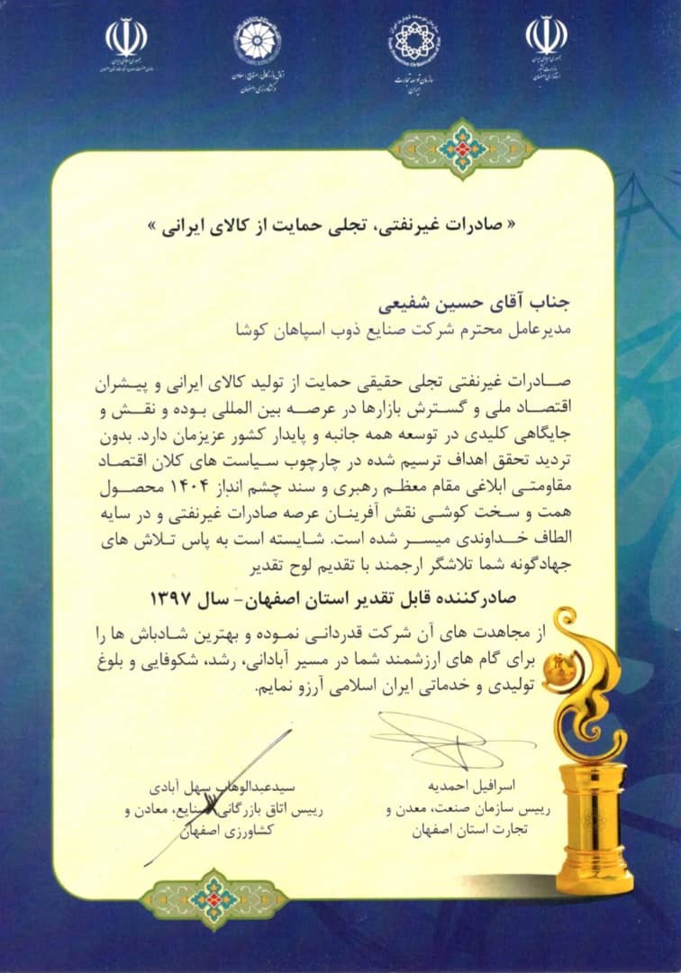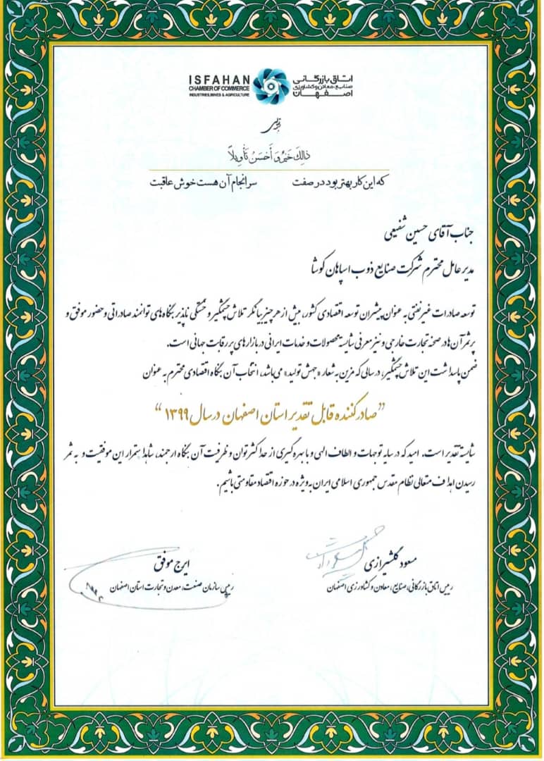 بر کیفیت محصولات، پاسخگویی به نیازهای مشتریان و تعهد به توسعه صادرات، موفق به کسب